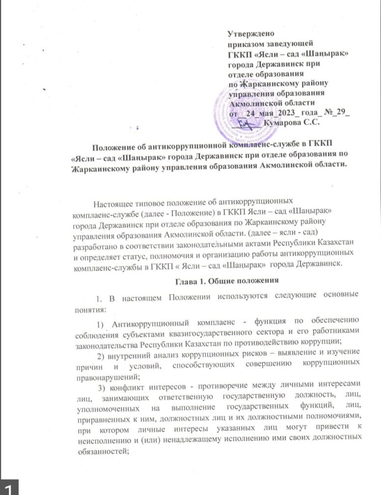 Положение об антикоррупционной комплаенс-службе в ГККП «Ясли – сад «Шаңырақ» города Державинск при отделе образования по Жаркаинскому району управления образования Акмолинской области.